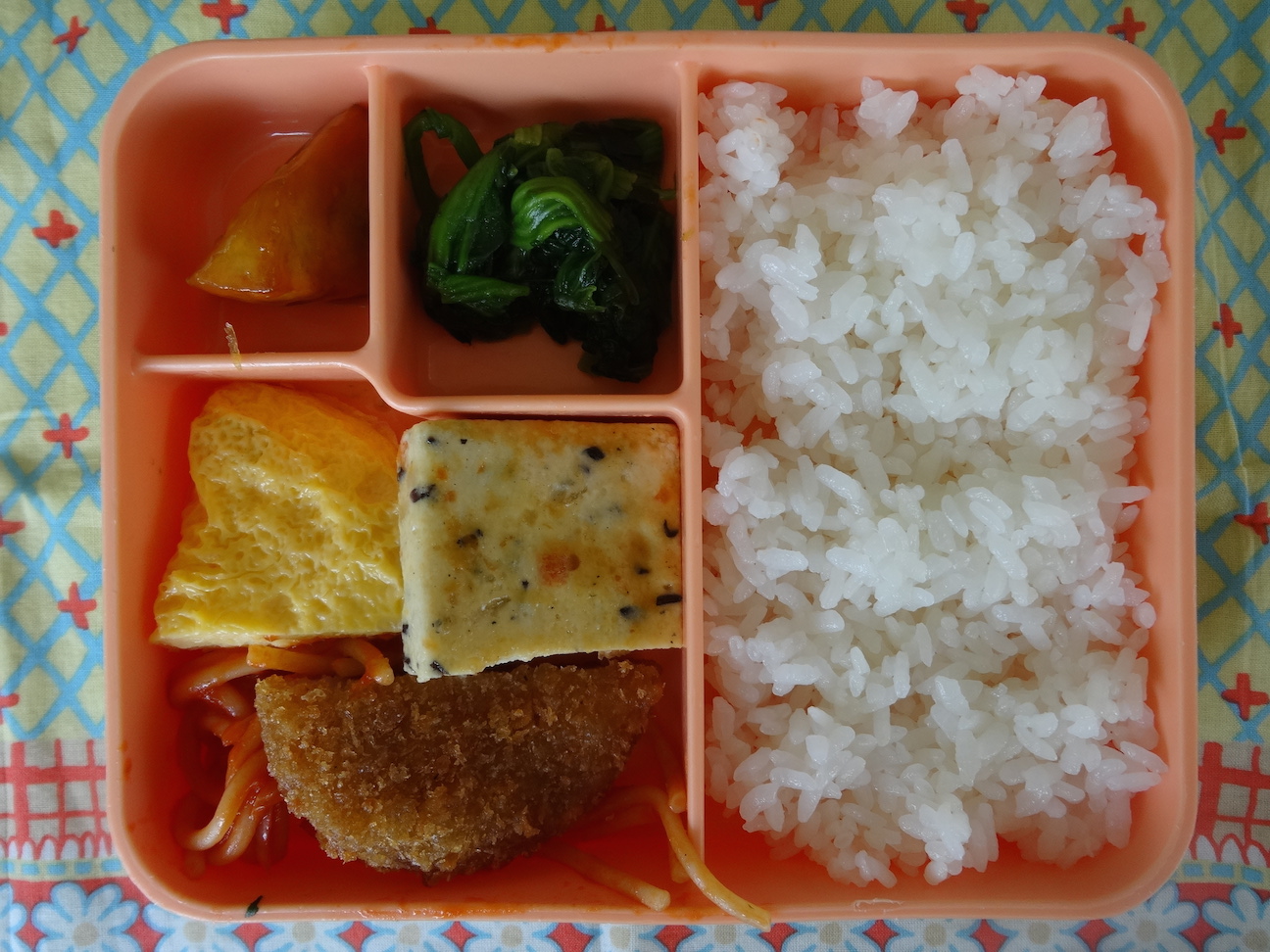 ハムカツ・オムレツ・ナポリタン・豆腐ステーキ・青菜のおひたし・大学芋・ごはん