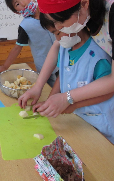 お味噌汁の具材は、みんなで話し合って、ジャガイモ・豆腐・もやしを入れることになりました。