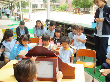 ジュース屋さんで買った飲み物を手にしながら、よみきかせコーナーでは紙芝居をじっくり鑑賞しました。