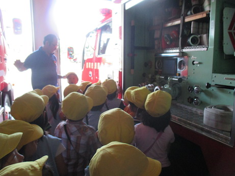園バスに乗って消防署に到着すると、署員の方たちが迎えてくださいました。
