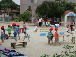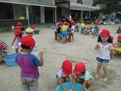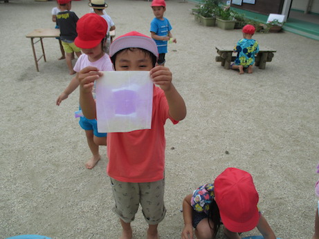 今日は、うめ組ともも組で園庭に出てにじみ絵をしました。