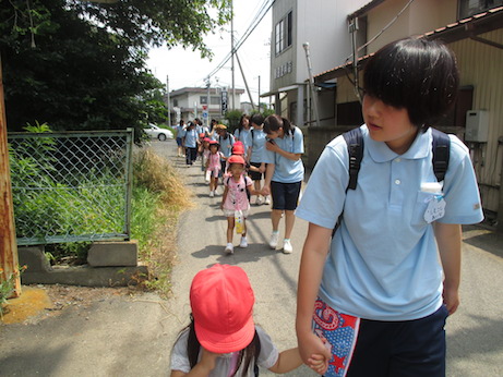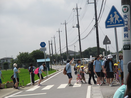 道路を歩いたり横断歩道を渡ったりするときには、手をピンっと挙げたり、左右の確認をしたりしながら、慎重に歩きました。
