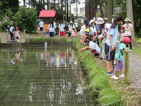 短大生のお姉さんや友達と、夢中になってザリガニ釣りをしている子どもたちでした。