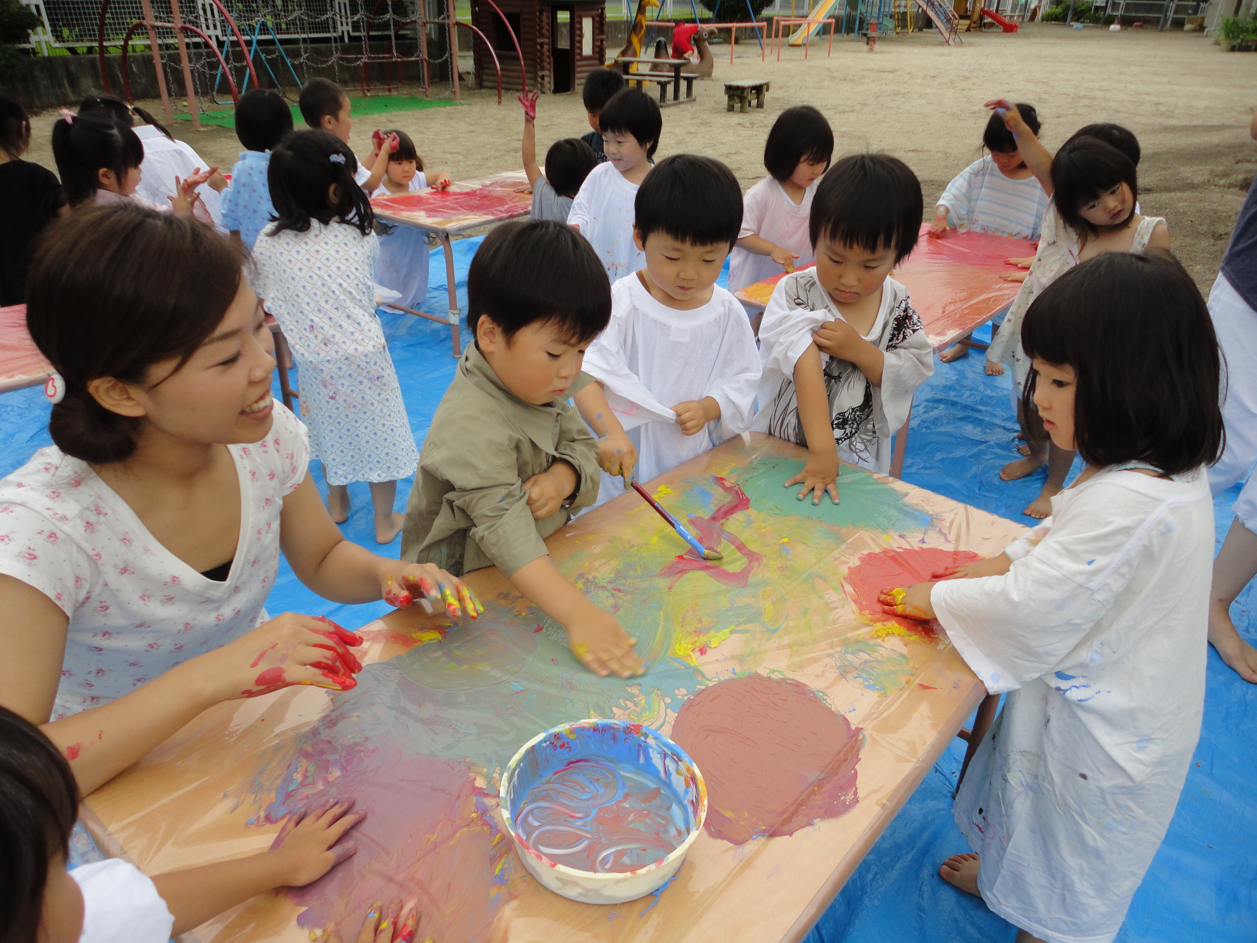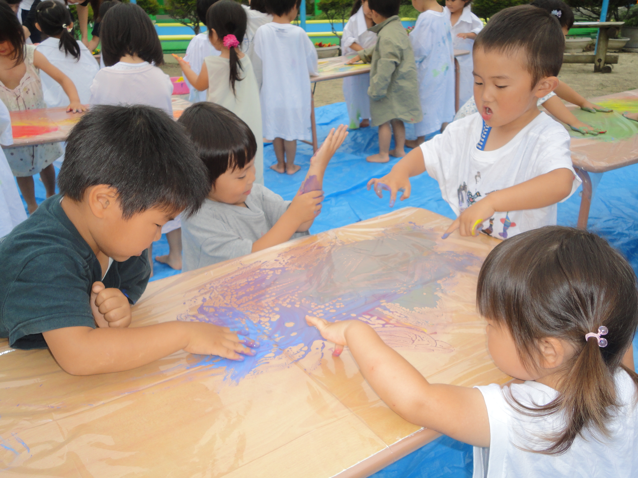 しばらくすると、絵を描いたり、手形をつけたり、絵の具の手でお友達と握手をしてみたり、感触を味わいながら遊んでいました。