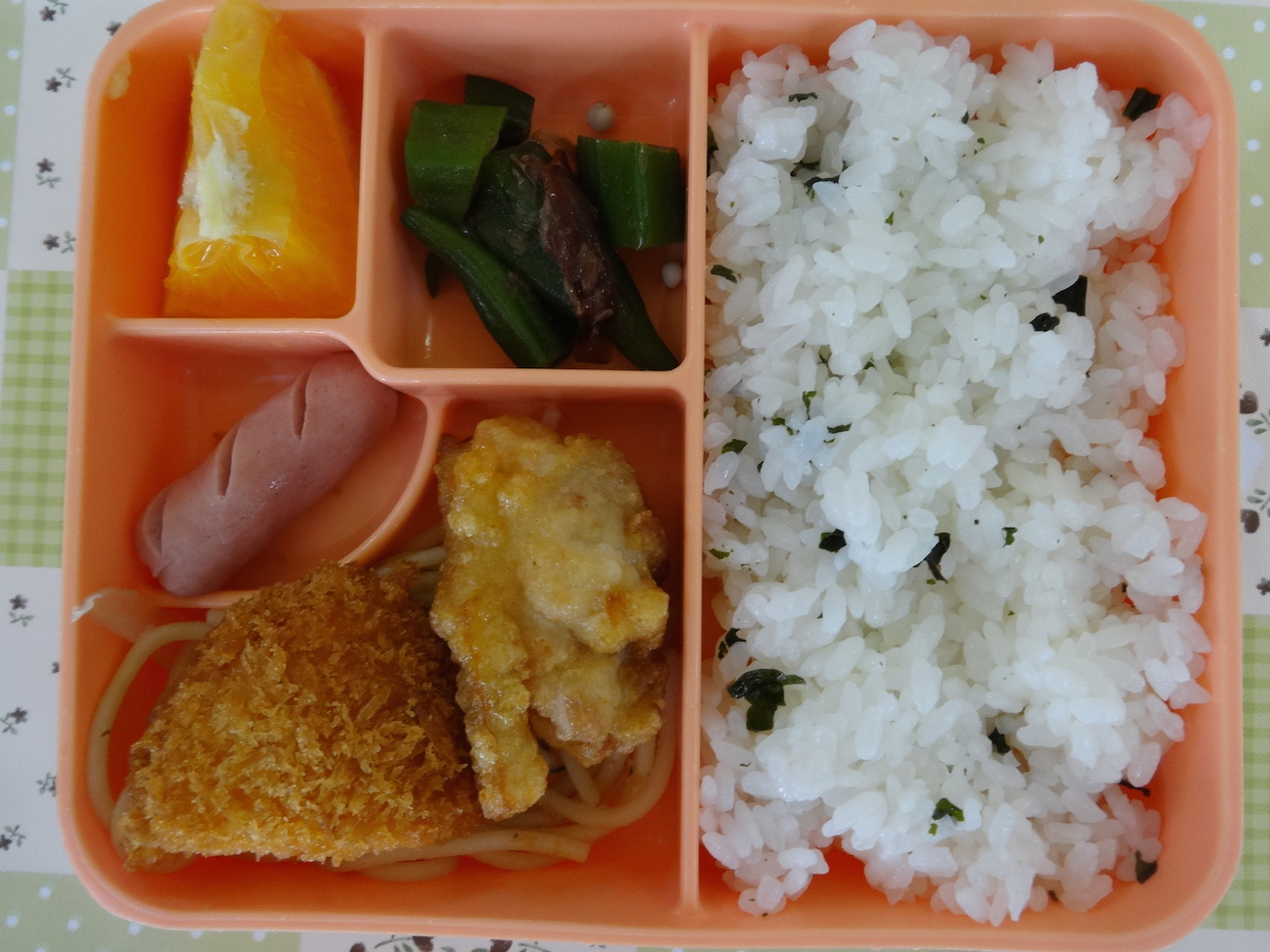 鶏の唐揚げ・エビマヨカツ・ほうれん草としめじのパスタ・ウィンナー・オクラのおかかあえ・オレンジ・わかめごはん