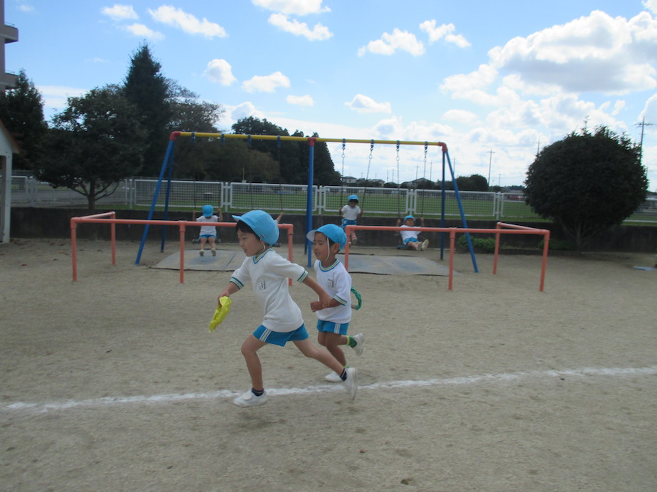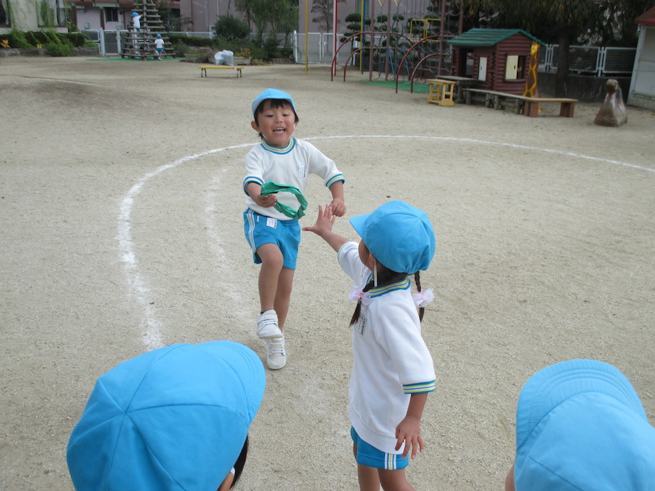 好きな色のバトンを持って走ったり、バトンパスをしたりとお兄さんお姉さんをまねながら楽しんでいました。