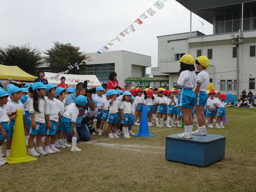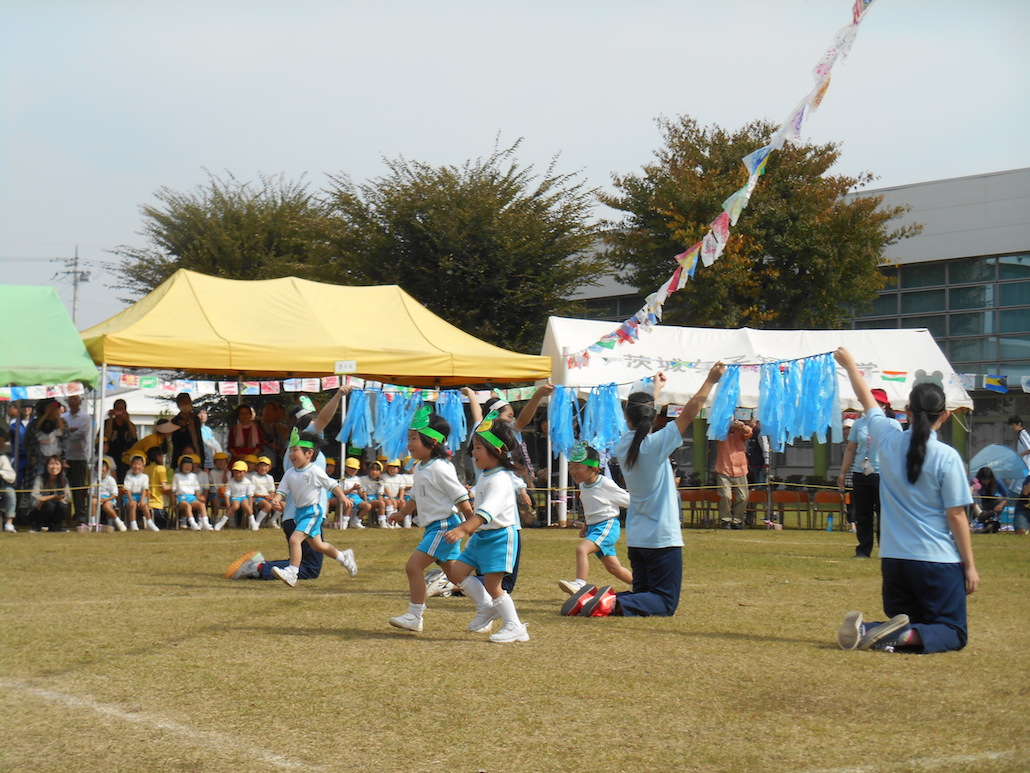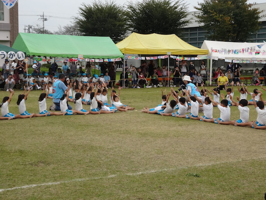 子どもたちが作った万国旗の下で、バナナくん体操や、アキレスケンタウルス体操を踊って、開会式を行いました。