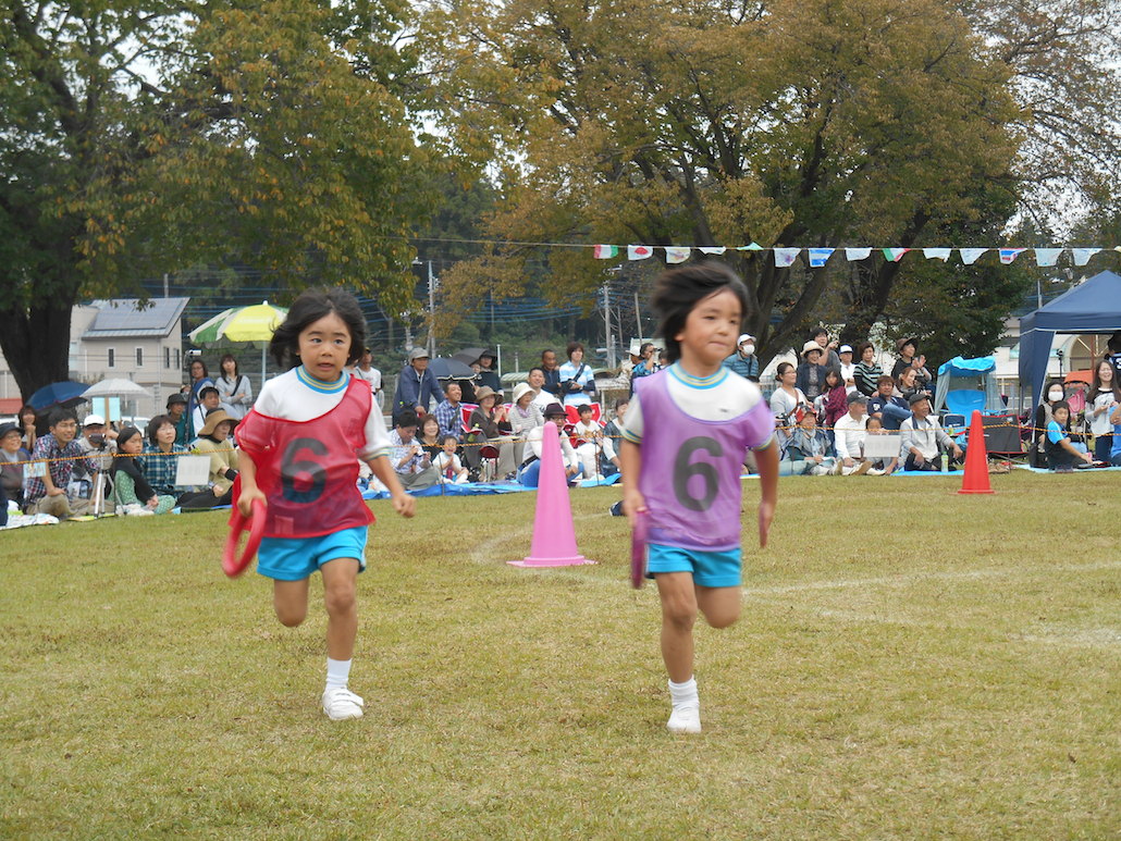 チーム対抗のリレーでは、それぞれが力一杯に走り、チームのみんなでバトンをつないでゴールを目指しました。