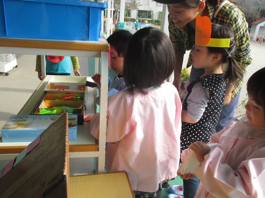 くださいな★ 2015 10/20 ニュース 年長組の友達が種屋さんを開いていました。 「く〜だ〜さい!!」 「100円です」 「・・・丸いお金かなぁ?」 「おつりです!」 フウセンカズラやヒマワリの種など、好きな種を選んで買う事ができました♪ ニュース URLをコピーしました! 今日の給食 10月20日(火) 今日の給食 10月21日(水) コメント コメントする コメントをキャンセルコメント ※ 名前 ※ メール ※ サイト 次回のコメントで使用するためブラウザーに自分の名前、メールアドレス、サイトを保存する。 上に表示された文字を入力してください。 Δ