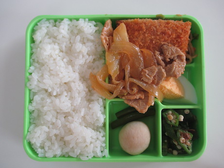 豚肉の生姜炒め・カレーコロッケ・中華風焼きそば・ゆで卵・オクラのおかか和え・さといもの煮物・ごはん