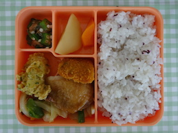 照り焼きチキン・アジフライ・焼うどん・ちくわの磯辺天・おくらのおかか和え・ポテトの煮物・ゆかりごはん
