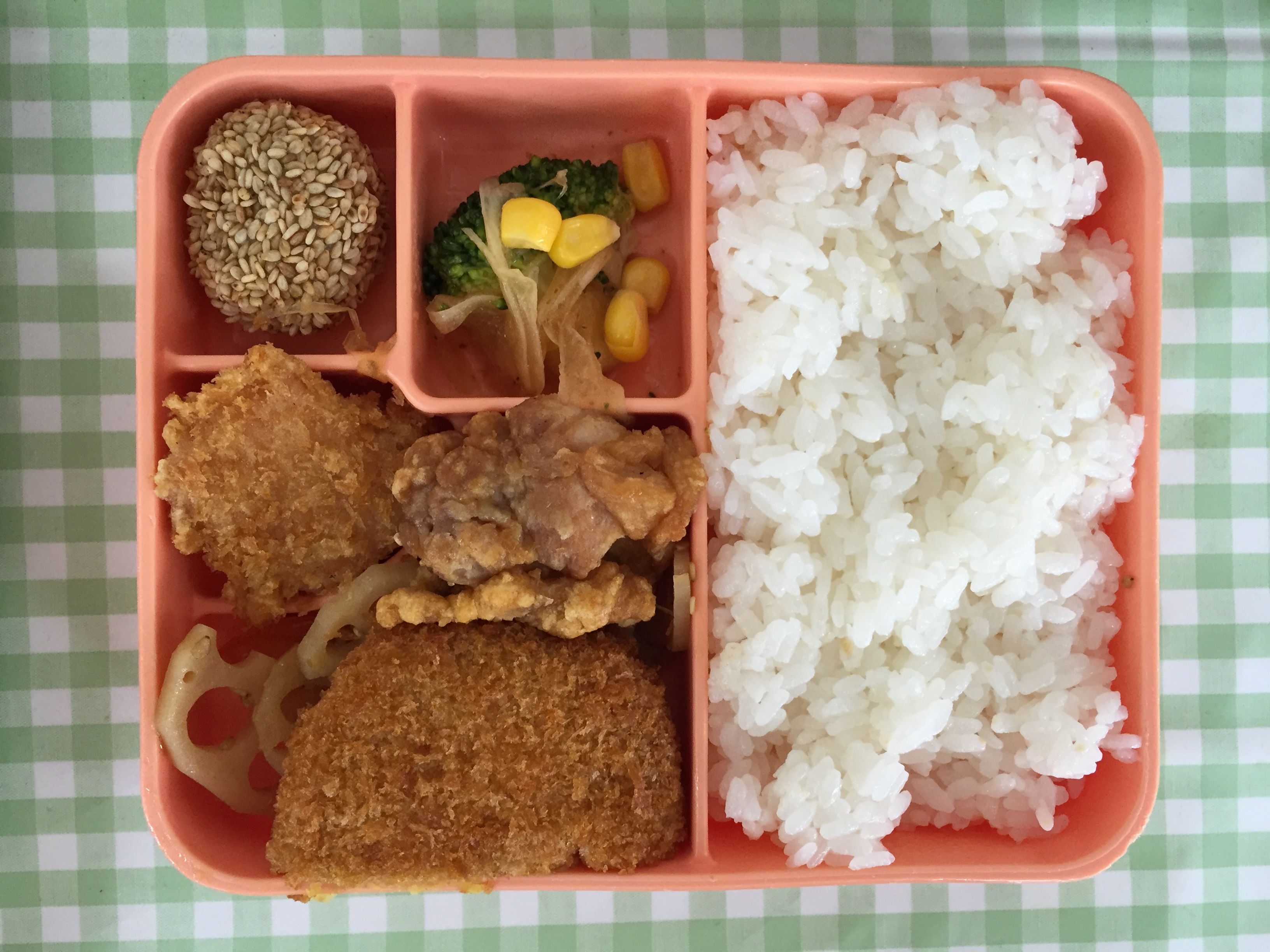 鶏の唐揚げ・カレーコロッケ・れんこんきんぴら・お魚ソーセージフライ・ブロッコリーの和風サラダ・ごはん