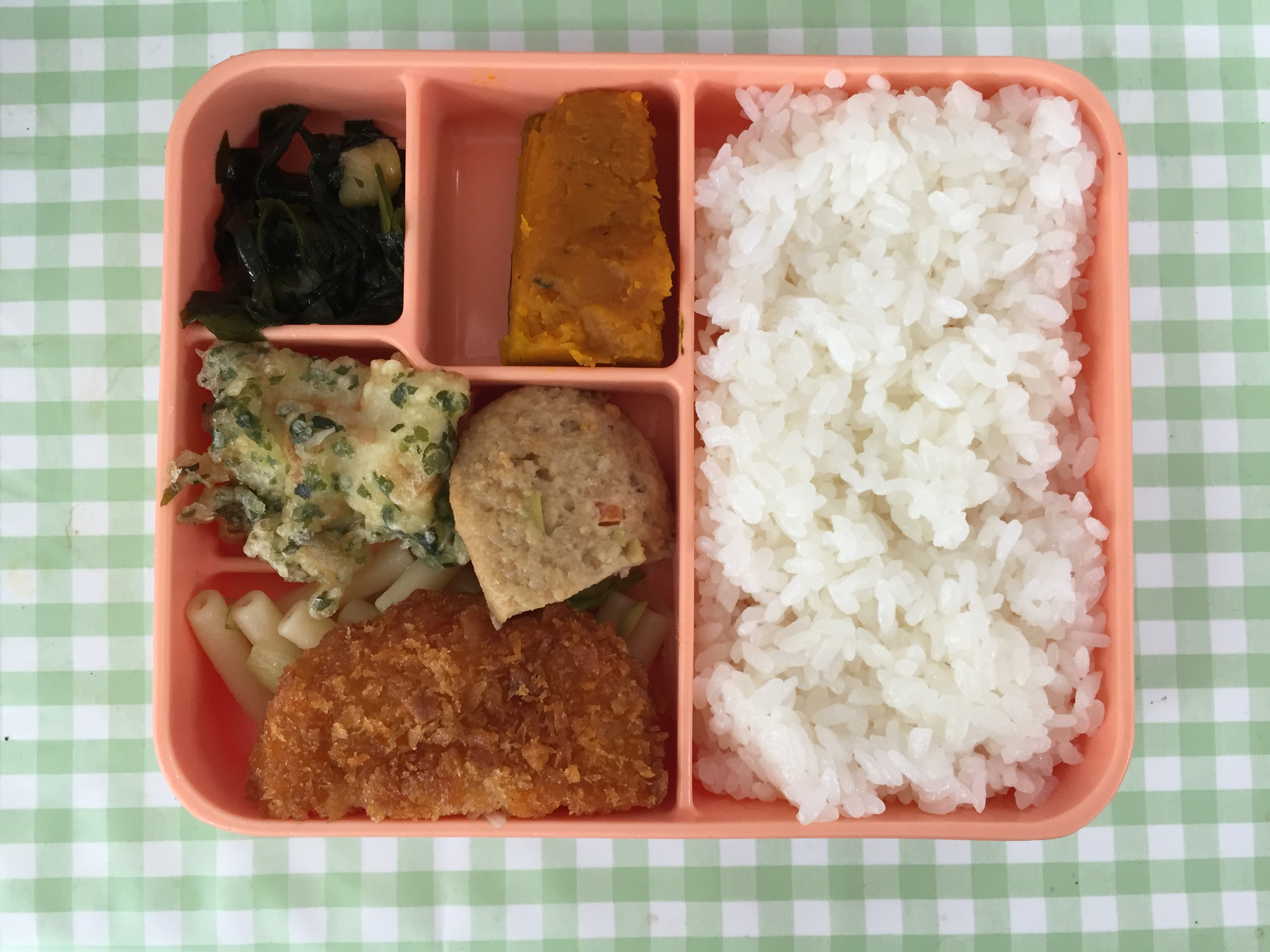 エビカツ・チキンハンバーグ・マカロニソテー・ちくわの磯辺天・チンゲンサイの中華ドレ和え・かぼちゃの煮物・ごはん