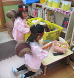 お部屋の中では、「今度はきつねになろ〜っと」「りすにしようよ」とやってみたい動物のお面やしっぽを身につけて遊びだしています。