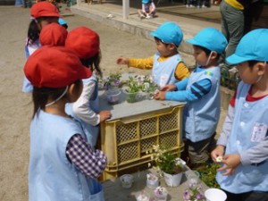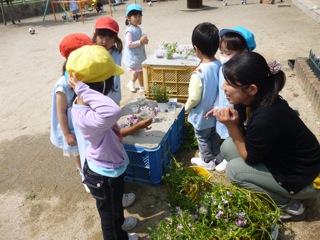 花壇に咲いた花を摘んでお花やさんが始まりました。