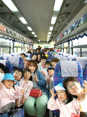 バスの中では、「バスごっこ」や「バスにのって」を歌って楽しく過ごしました。