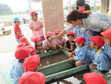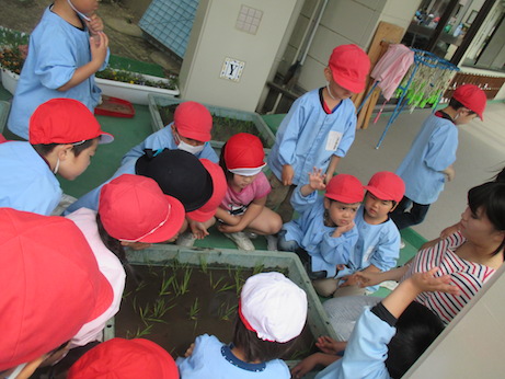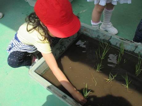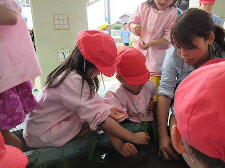 さくら組、ふじ組では譲っていただいた土と苗を使って、田植えをしました。