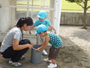 なかなかいいアイデアを出し合っています。先生は遊びのおもしろさを引き出す役目をしています。