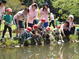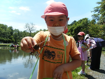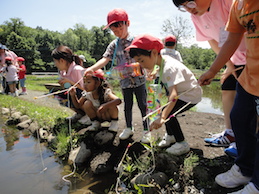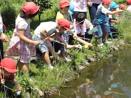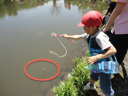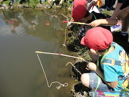 5歳児は、ザリガニ釣りに夢中です。自分たちで作ってきた釣り竿を使っています。