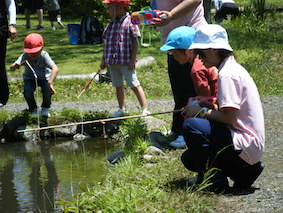 ふじ組やさくら組のお友達の真似をしてザリガニ釣りに挑戦する子もいました。