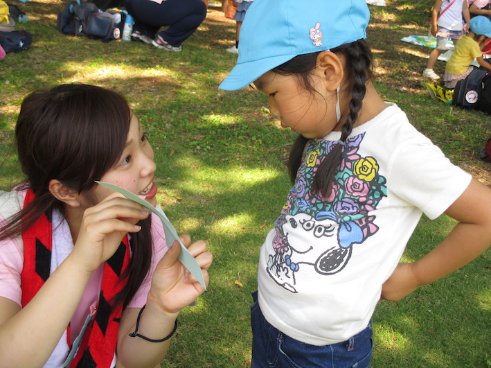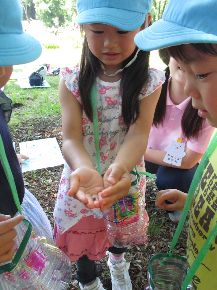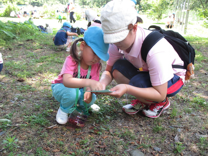 ビンゴカードには、「きいろいはな」「だんごむし」「とりのこえ」「ちいさいちょうちょ」「ちくちくするもの」「においのするはな」「ざらざらするくさ」「あり」「てんとうむし」と書かれていました。子どもたちは書かれているものを一生懸命探しに出かけました。