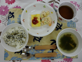 ごま塩ご飯・わかめスープ・ズッキーニ入り卵焼き・じゃがいもとツナのサラダ・麦茶