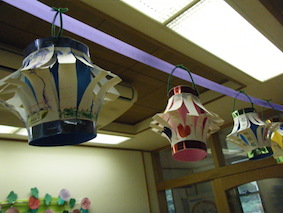 キラキラテープを付けたり、好きな絵を描いたりしてオリジナルの提灯が出来上がりました。早速、クラスに飾っていくと一気にお祭りの雰囲気になりました。
