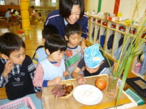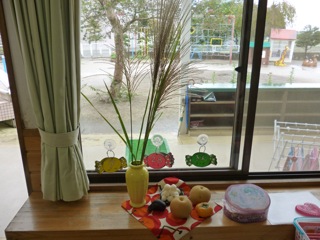 ススキ 梨 柿 サツマイモなど、秋に収穫されたものが飾られています。