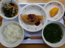 ご飯・味噌汁(じゃが芋・ほうれん草・長ねぎ)・たらのフライ・海藻サラダ・柿・麦茶