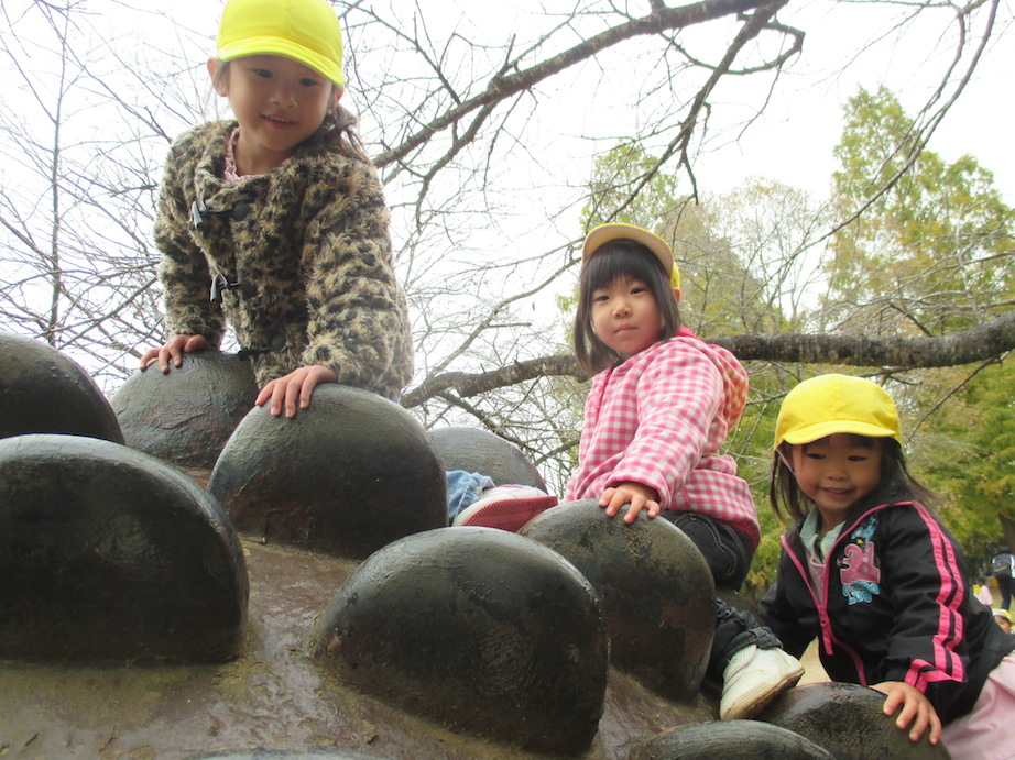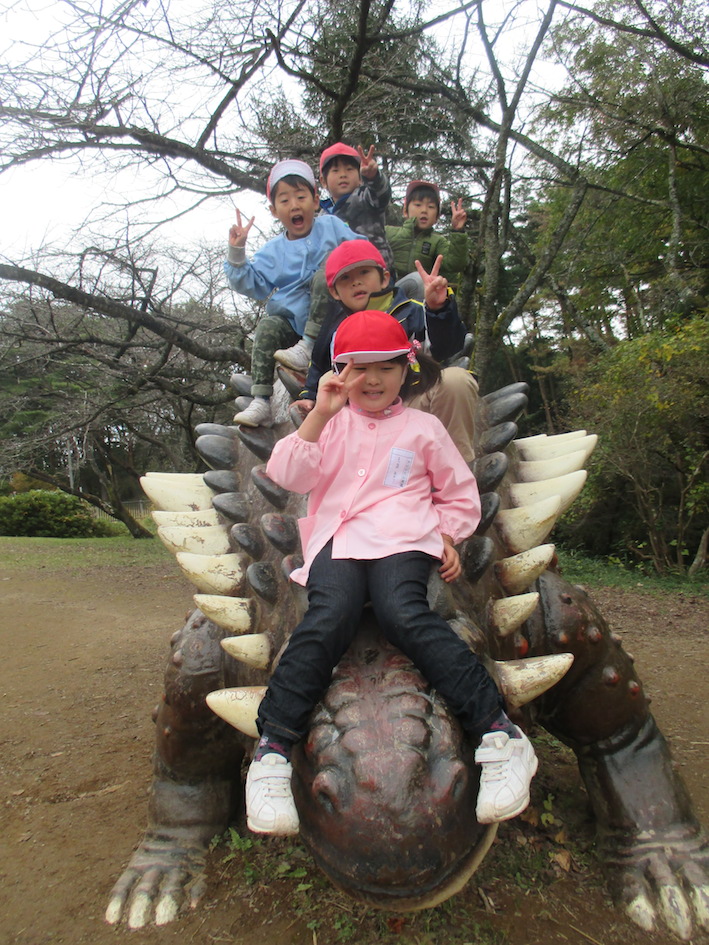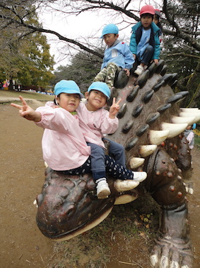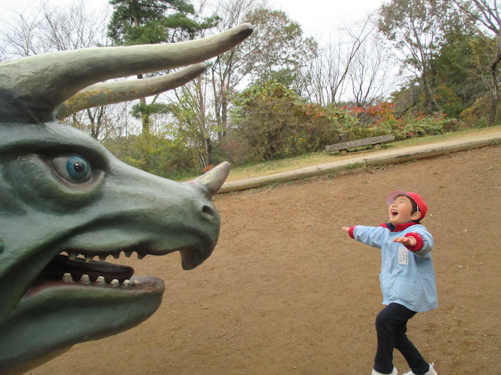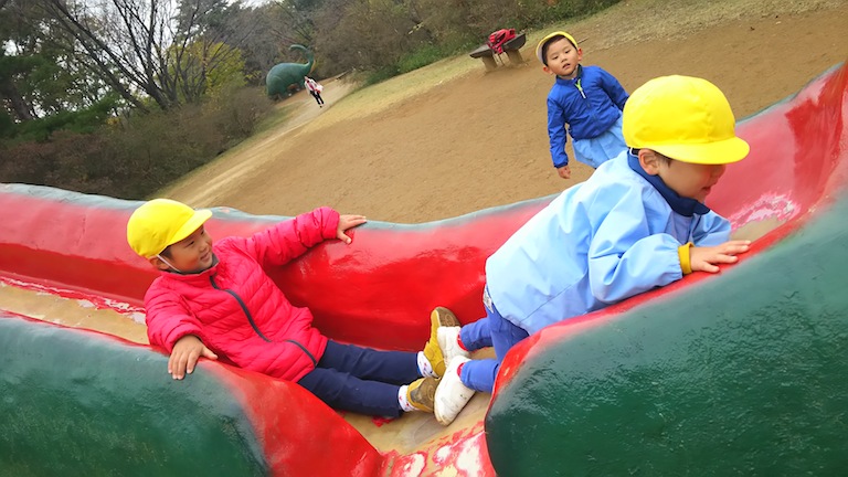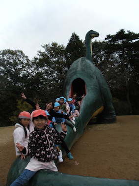 森林公園では、恐竜広場やローラー滑り台で遊びました。
