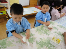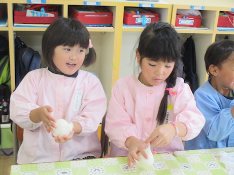 5歳児クラスで育てたお米を使って,おにぎり作りをしました。