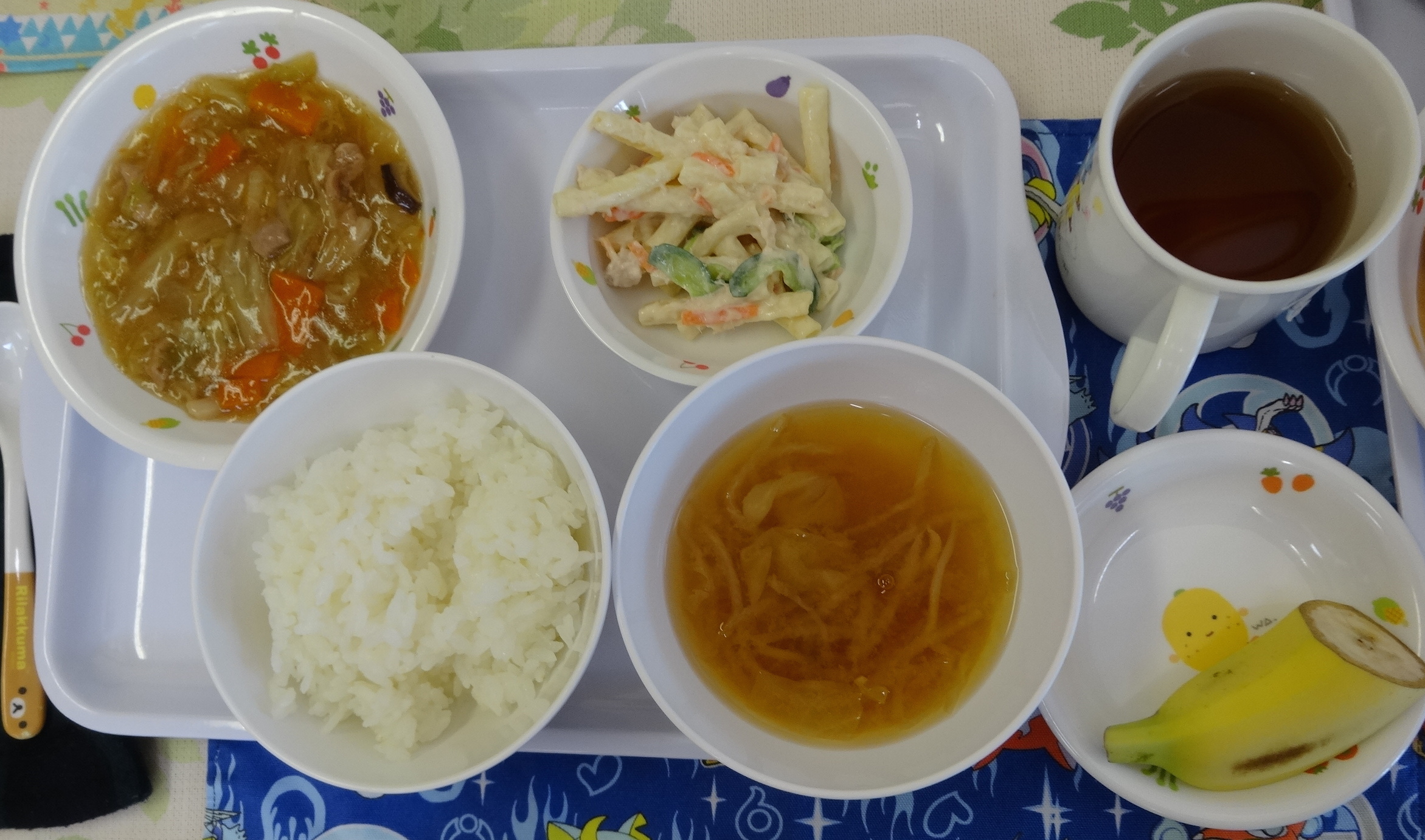 ごはん・みそ汁・八宝菜・マカロニツナサラダ・バナナ・麦茶