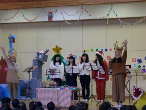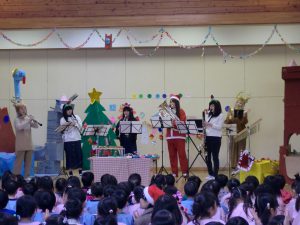 短大から、サンタさんやトナカイさん、小人さんの音楽隊のみなさんが、コンサートを開いてくれました。