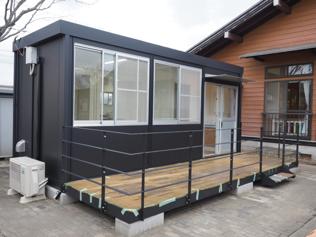 水洗トイレ、簡易キッチン、エアコン、ベッド設置スペース(2台)などの設備があるほか、保護者が看護師と相談できるスペース(デッキ)も確保してあります😃