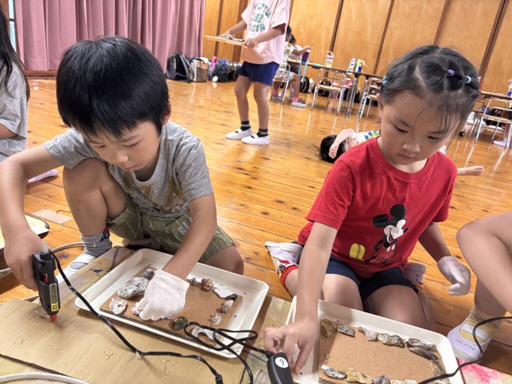 クラスに戻り海岸で集めた貝殻でフォトフレームを作ります🐚