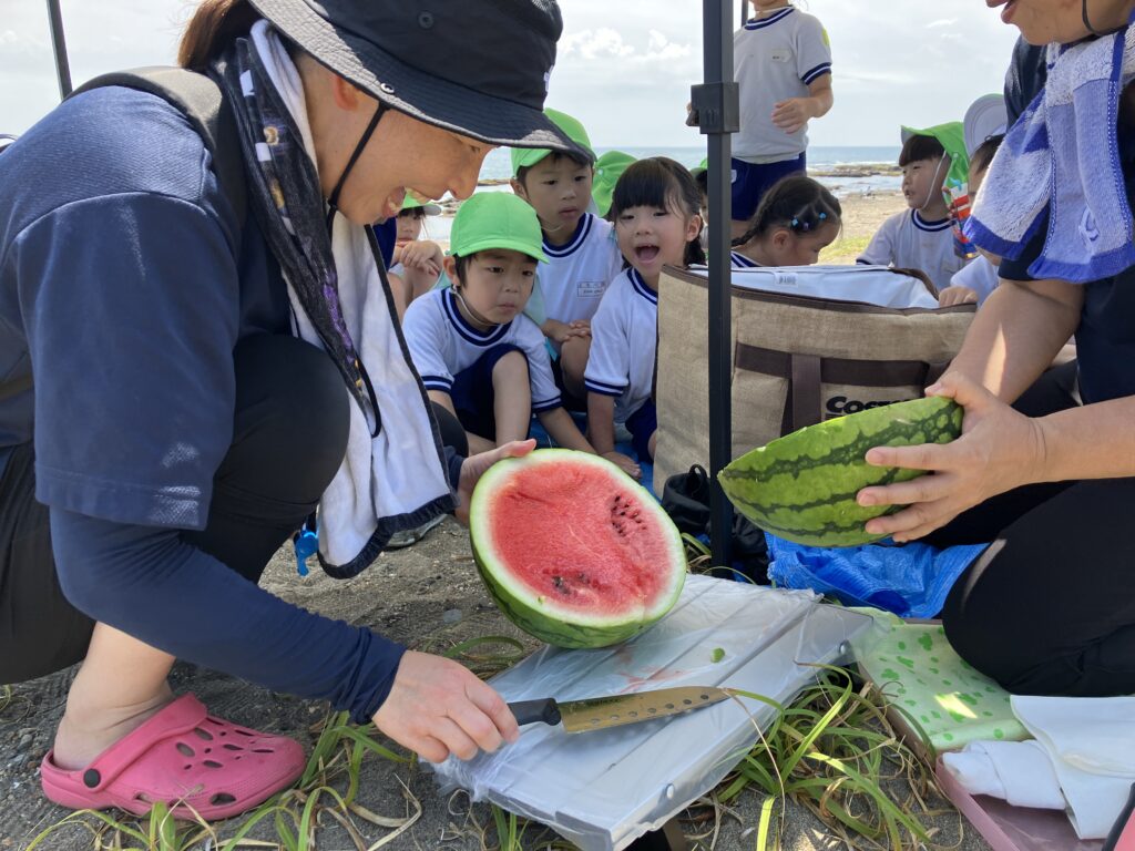 子どもたちが園の畑で作ったスイカを海岸で食べました、甘くて美味しかったね🍉